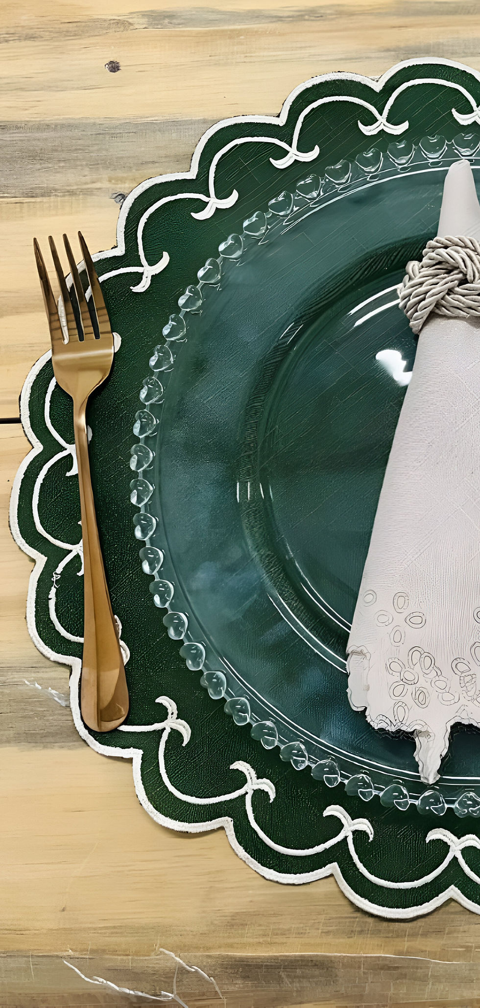 Jogo americano em 100% poliéster, super prático e fácil de limpar. Com um toque de elegância no acabamento bordado, ele tem 40x50 cm e traz o charme da cor verde com bordado branco. Perfeito para transformar seu natal em uma experiência inesquecível!